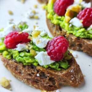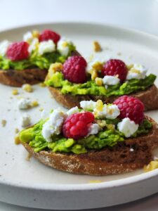 Ant duonelės tepame trintą avokadą, dedame ar pirštais trupiname ožkos sūrį.