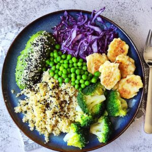 Lėkštės surinkimas: Į lėkštę dedame kynvą, šalia išdėliojame paruoštas daržoves: brokolius, žirnelius, raudonąjį kopūstą bei pjaustytą avokadą. Galiausiai dedame dar karštus vištienos kepsnelius.