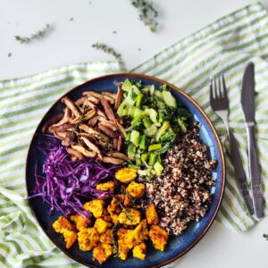 Lėkštėje išdėliojame šiltą bolivinę balandą, traškų tofu, atskirai keptus grybus, ryškias žalias daržoves ir šviežią violetinį kopūstą.