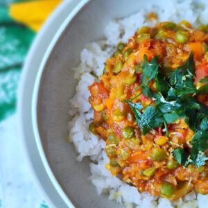 Patiekdami dedame virtų ryžių, ant viršaus pilame troškinį, užbarstome smulkintų petražolių, nutarkuojame šiek tiek citrinos žievelės ir užpilame kelis lašus alyvuogių aliejaus.