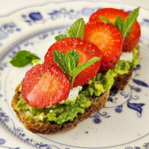 Ant paskrudintos duonos tepame sutrintą avokadą, dedame ožkos sūrį, o ant viršaus riekelėmis pjaustytas braškes.