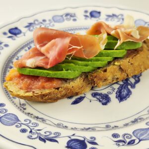 Ant paskrudintos duonos tepame tarkuotą pomidorą, pjaustytą avokadą bei vytintą kumpį.