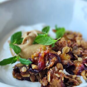 Į dubenį dedame graikišką jogurtą, ant viršaus – karamelizuotas slyvas su traškiais dribsniais ir šaukštelį anakardžių kremo.