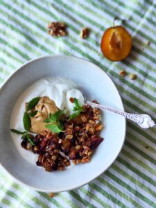 KARAMELIZUOTOS SLYVOS SU TRAŠKIAIS DRIBSNIAIS IR JOGURTU