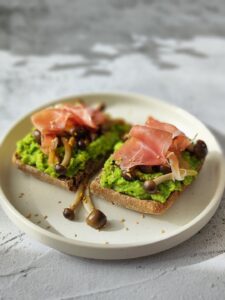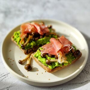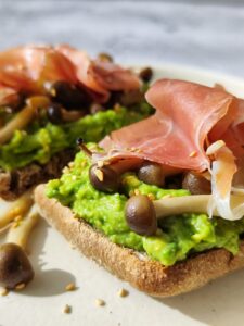 Ant paskrudintos duonos (arba neskrudintos jeigu taip mėgstate), tepame trintą avokadą, dedame apkeptus grybus, barstome sezamų sėklomis ir ant viršaus uždedame vytinto kumpio.