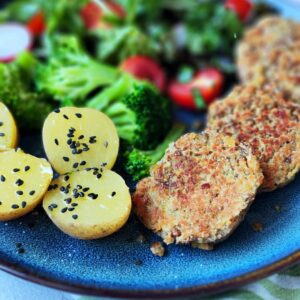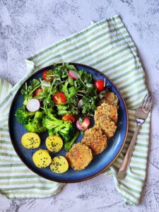 Patiekiame taip kaip norisi: su bulvių koše, raugintomis daržovėmis arba šviežiomis salotomis. Šįkart valgėm su šviežiomis salotomis, lengvai apvirtais brokoliais ir su lupena virtomis bulvėmis. Viską papildomai apšlaksčiau alyvuogių aliejumi.