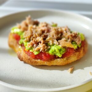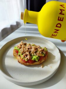 Ant skrudintos duonos pilame šlakelį alyvuogių aliejaus, dedame tarkuotą pomidorą, trintą avokadą, dar šlakelį alyvuogių aliejaus ir žiupsnelį druskos.