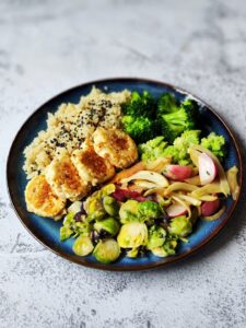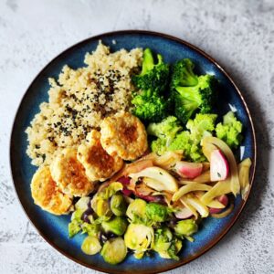 Šįkart kotletus valgiau su bolivine balanda, trumpai apvirtu brokoliu bei romanesco, taip pat su lengvai apkeptu pankoliu su ridikėliais ir čiobreliais, bei briuselio kopūstais su raudonuoju svogūnu ir česnaku. (Bolivinę balandą, pankolį bei briuselio kopūstus buvau gaminusi vakarienei, tad liko ir pietums)