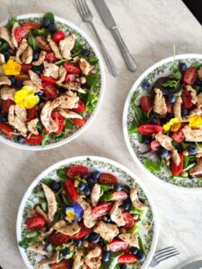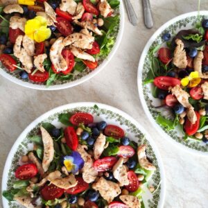 Lėkštėje dėliojame ingredientus ir keptą vištieną. Paprastai salotas gardinu šlakeliu gero ypač tyro alyvuogių aliejaus ir trupučiu citrinos sulčių.