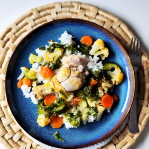 Tuomet į puodą sudedame didesniais kubeliais pjaustytą cukiniją ir nedideliais žiedynais išskaidytą kalafiorą, taip pat lapinį kopūstą.